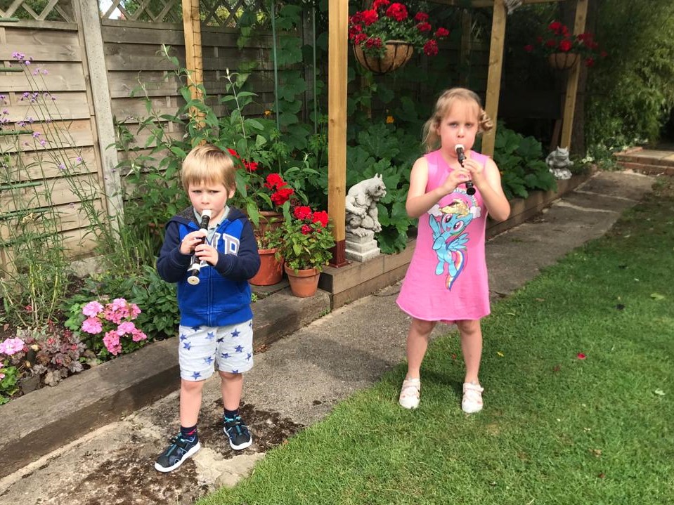 As the sun was shining after lunch, the children asked if they could go in the garden and specifically requested to play musical instruments – Grandad Lawrie’s favourite activity (or not!). Typically, and having a box full of musical instruments to choose from, both Genevieve and James chose the loudest recorders available and paraded around the garden as though they were the Pied Piper being followed by a hoard of rats.