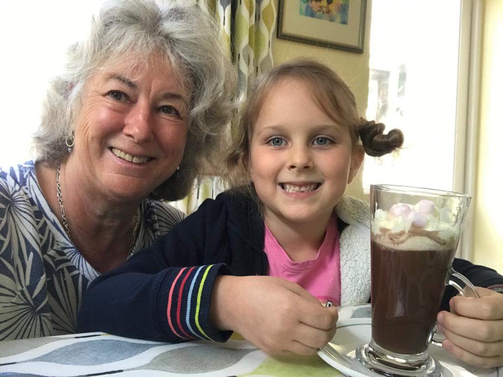 Genevieve arrived first as James had an online meeting with his new teacher. She immediately asked for a cup of hot chocolate, which Grandma Lindsey was happy to provide – with squirty cream and marshmallows on top. It’s a pity that her selfies are not as perfect as her hot chocolate making!