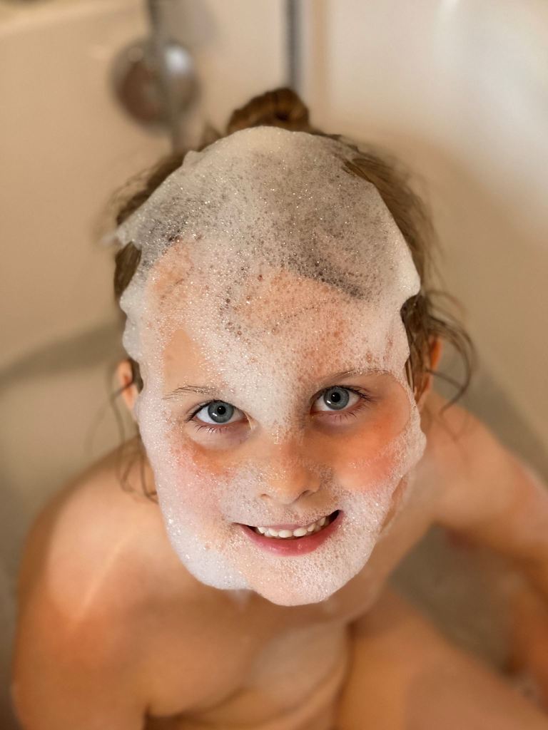 Megan went to collect Genevieve from school and then whisked her in to a bubble filled bath as soon as she was through the door (part of the school-mandated COVID system). There were the usual hi-jinks and shenanigans with the bubbles, but then Genevieve slipped and ended up with a face full of foam. I could hear the giggles from downstairs!