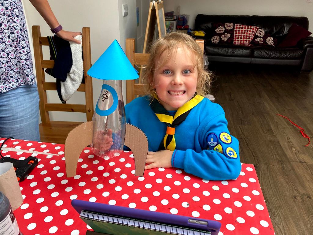 I went to collect James as Megan was helping Genevieve prepare for her Beaver meeting on Zoom. Today they were constructing a space rocket out of a plastic bottle, loo rolls and a variety of cardboard shapes. The whole thing was seemingly held together with a thick layer of acrylic paint and half of Megan’s glue gun supply. The resulting rocket was magnificent though!