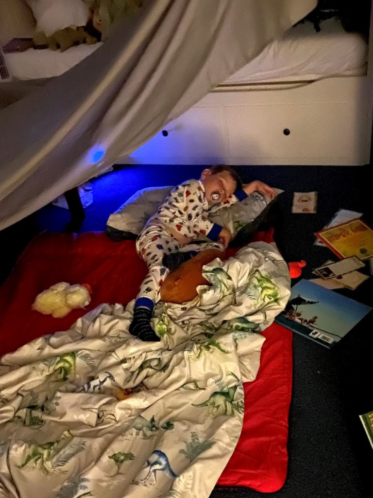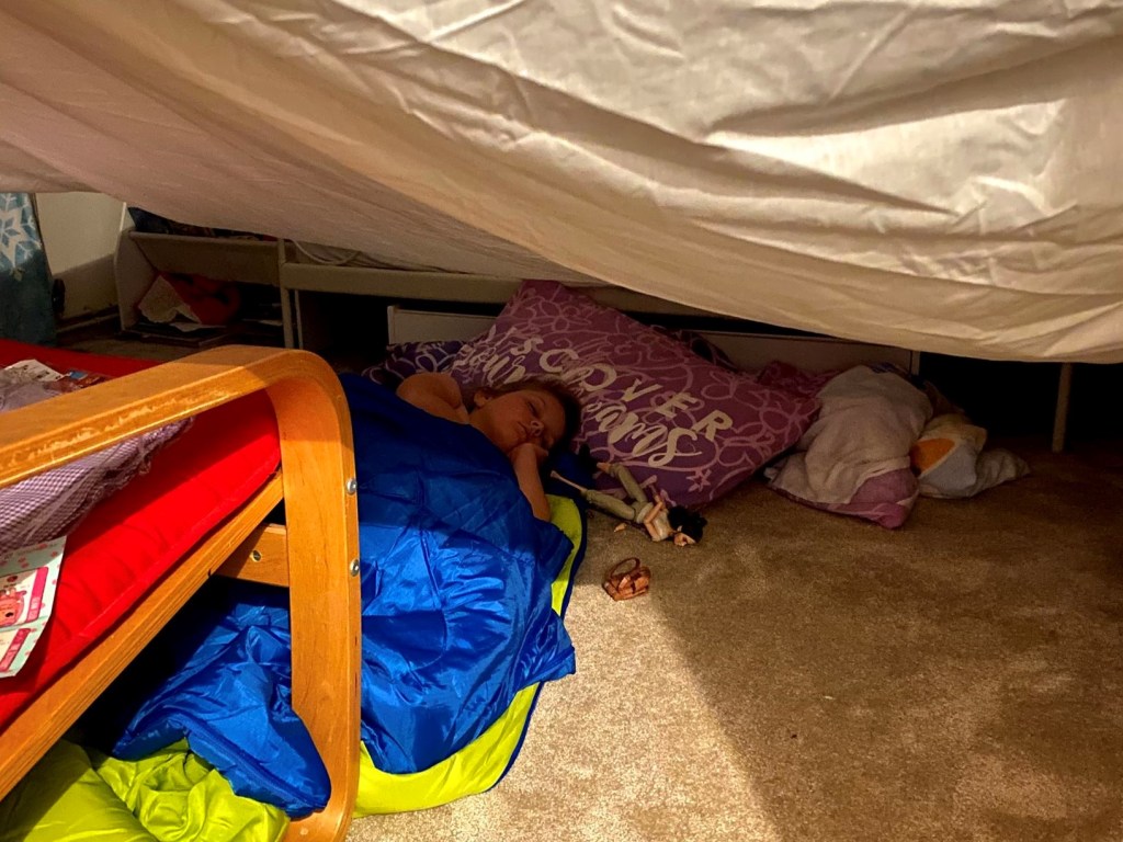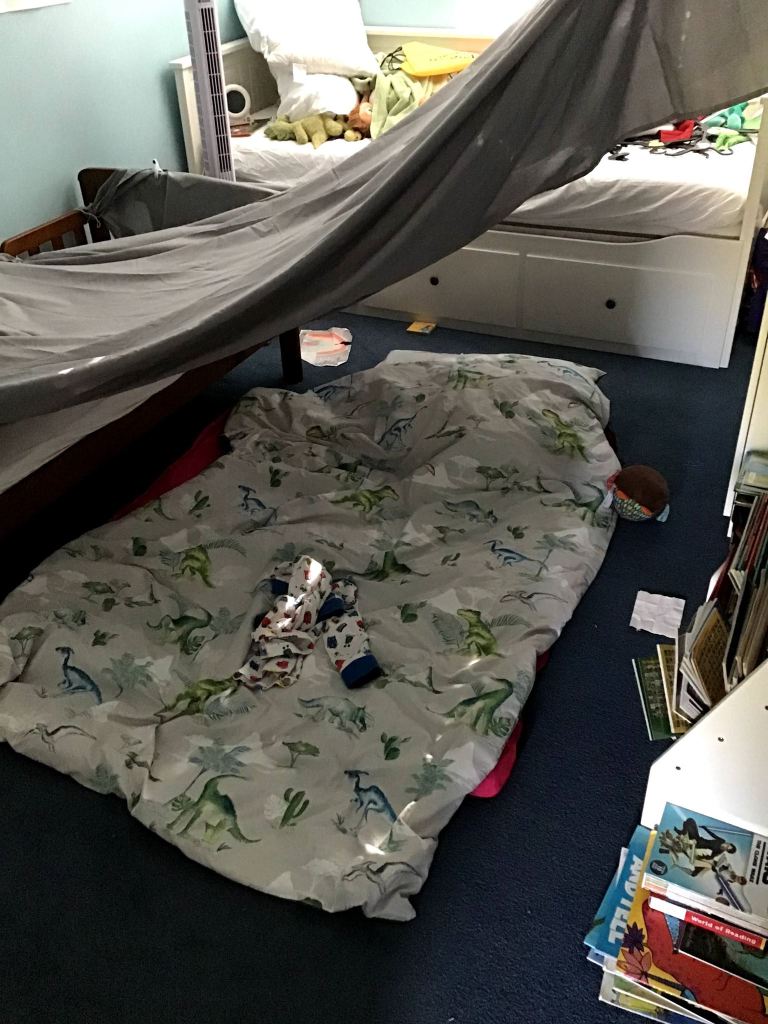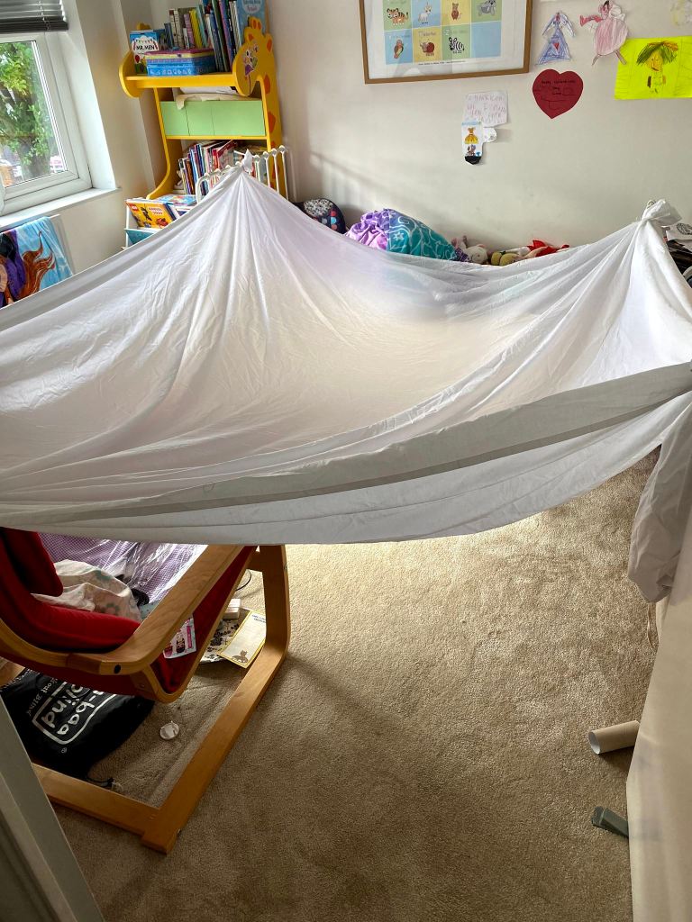 Once we’d got back home, I left the kids playing with Stephen as I set up dens in their bedrooms. There was a virtual Scout camp this evening and Genevieve could earn a badge by sleeping in a den. Of course James wanted to take part two, so one den soon became two.