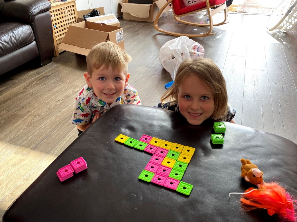 Stephen tried one of our new holiday games on the kids – it’s called “OK Play” and is like a free-form version of Connect Four. Overall it was a success but there were some teething problems as the children learned how the games worked. He orchestrated proceedings so that James won the first game and was planning on letting Genevieve win the second round, but he got grumpy with her poor sportsmanship and attitude during game two so won it myself. With Genevieve chastised, he did then arrange for her to win game three.