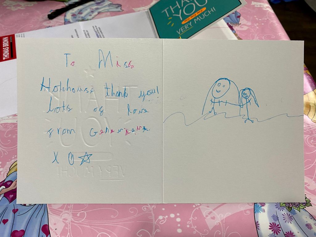 While James was upstairs getting ready for bed, Genevieve wrote beautiful end-of-term thank you cards for her teacher and teaching assistant. While the writing was very good, she took and unorthodox approach and wrote on the left of each card. She resolved the issue by adding pictures on the right, so it was all good in the end.