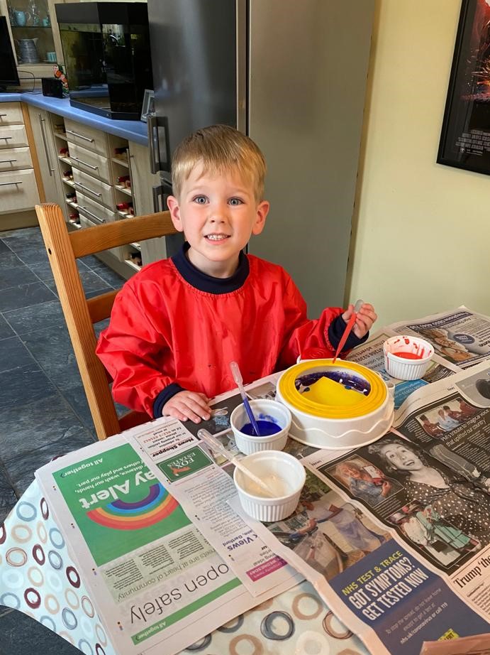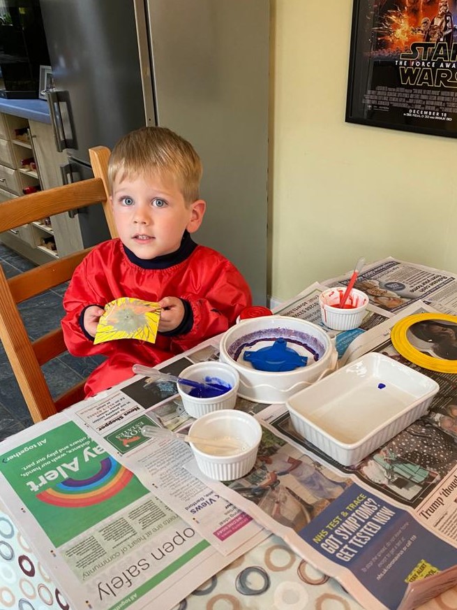 After lunch and quiet time watching cartoons on the TV, James was delighted that his request to make some spinning paint pictures was readily agreed to. He was genuinely pleased with the outcome (the tie dye, psychedelic colours effect) and looking forward to showing his efforts to mummy and daddy when he got home.