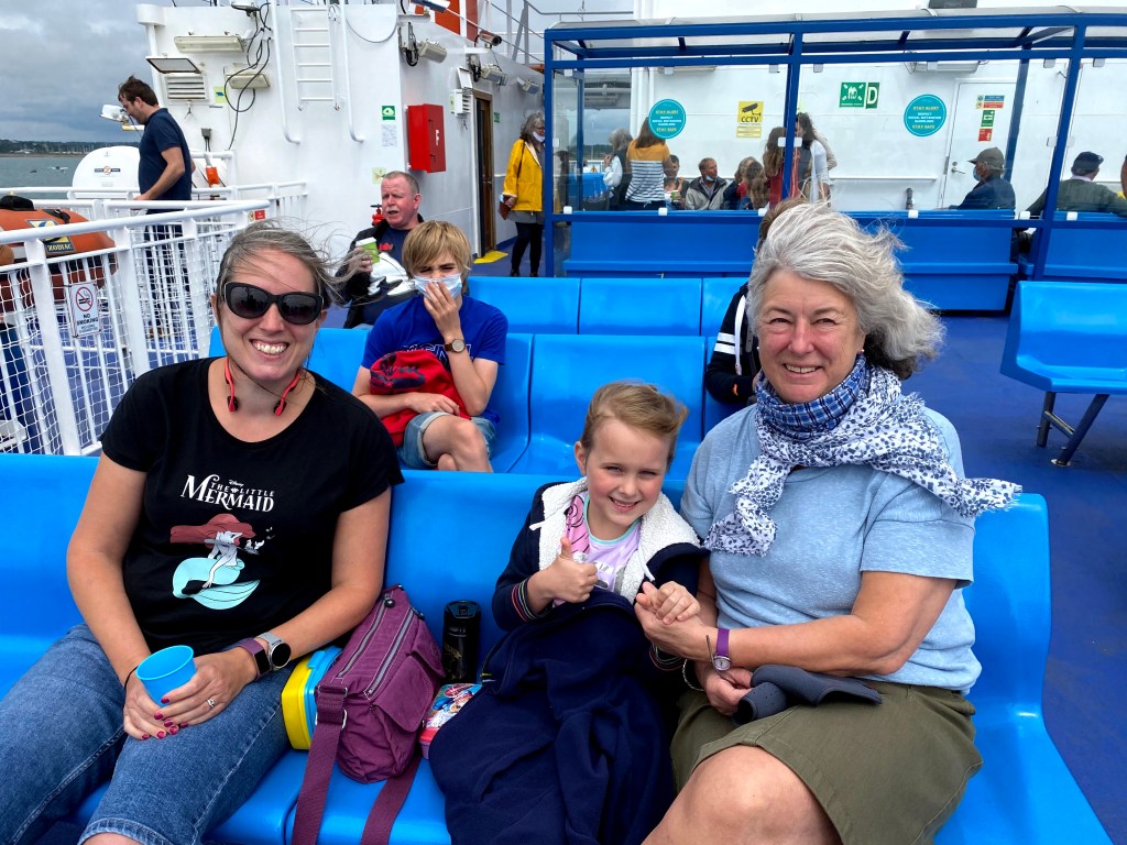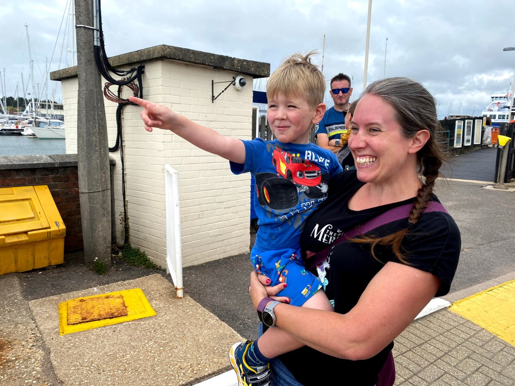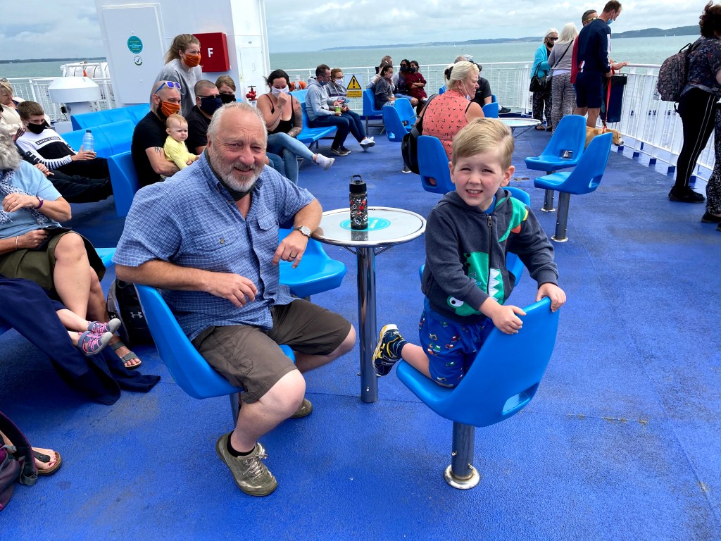 There was more excitement as we drove on to the ferry when we realised our whole level was a rising platform. The kids were initially a bit freaked out when the floor started moving but this soon turned to fascination as the walls drifted past. As soon as we stopped moving we made a dash out of the car to get a good seat on the deck. We got seats right at the front with brilliant views (although it was a tad windy). Once we’d departed we pointed out the the sights (mainly the Needles), waved to other boats and counted the buoys. Despite our best efforts there was some very dubious social distancing on deck – people just kept on standing next to us seemingly without a care in the world. Oh well.