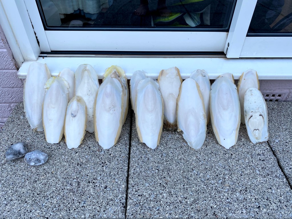 It has been a very wet and tiring but hugely entertaining day. And Grandad Lawrie had a sizeable haul of cuttlefish bones to take home so he was a very happy camper indeed.