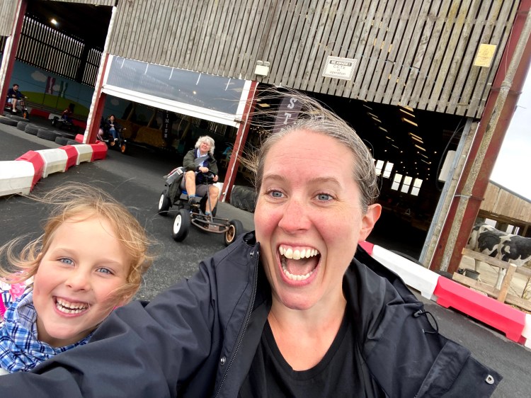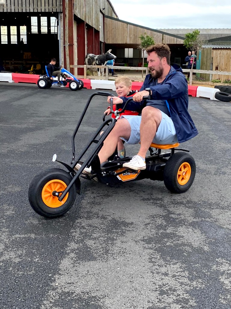 Genevieve had a go driving a go-kart but it was a bit too heavy for her to steer, so Megan jumped on board and took over the controls. The weather turned nice again so most of the other farm visitors ventured out to the giant bouncy pillow. This meant that we all got to go round and round the go-kart course for ages. Grandma Lindsey even got involved while Grandad Lawrie was the official race photographer.