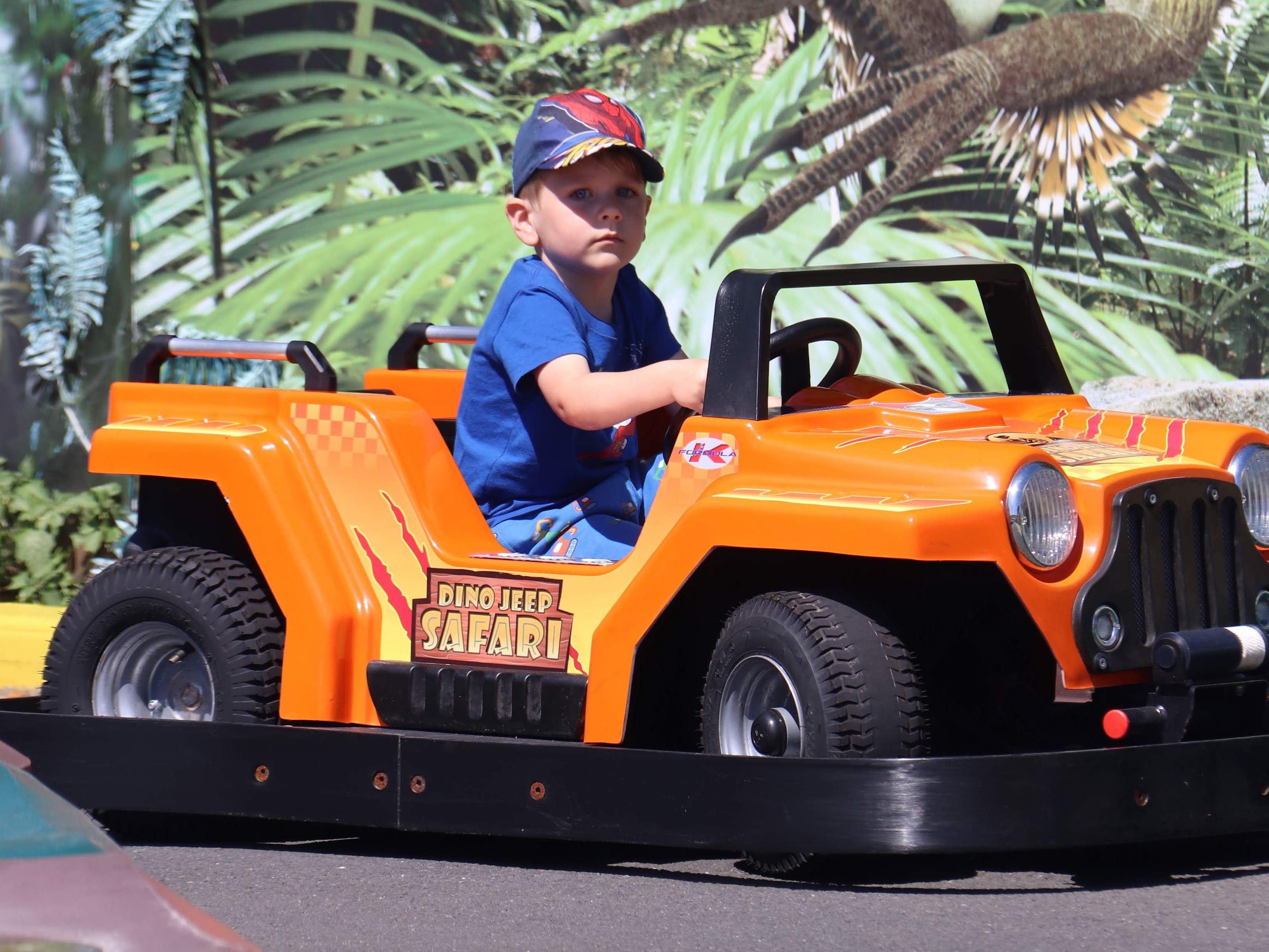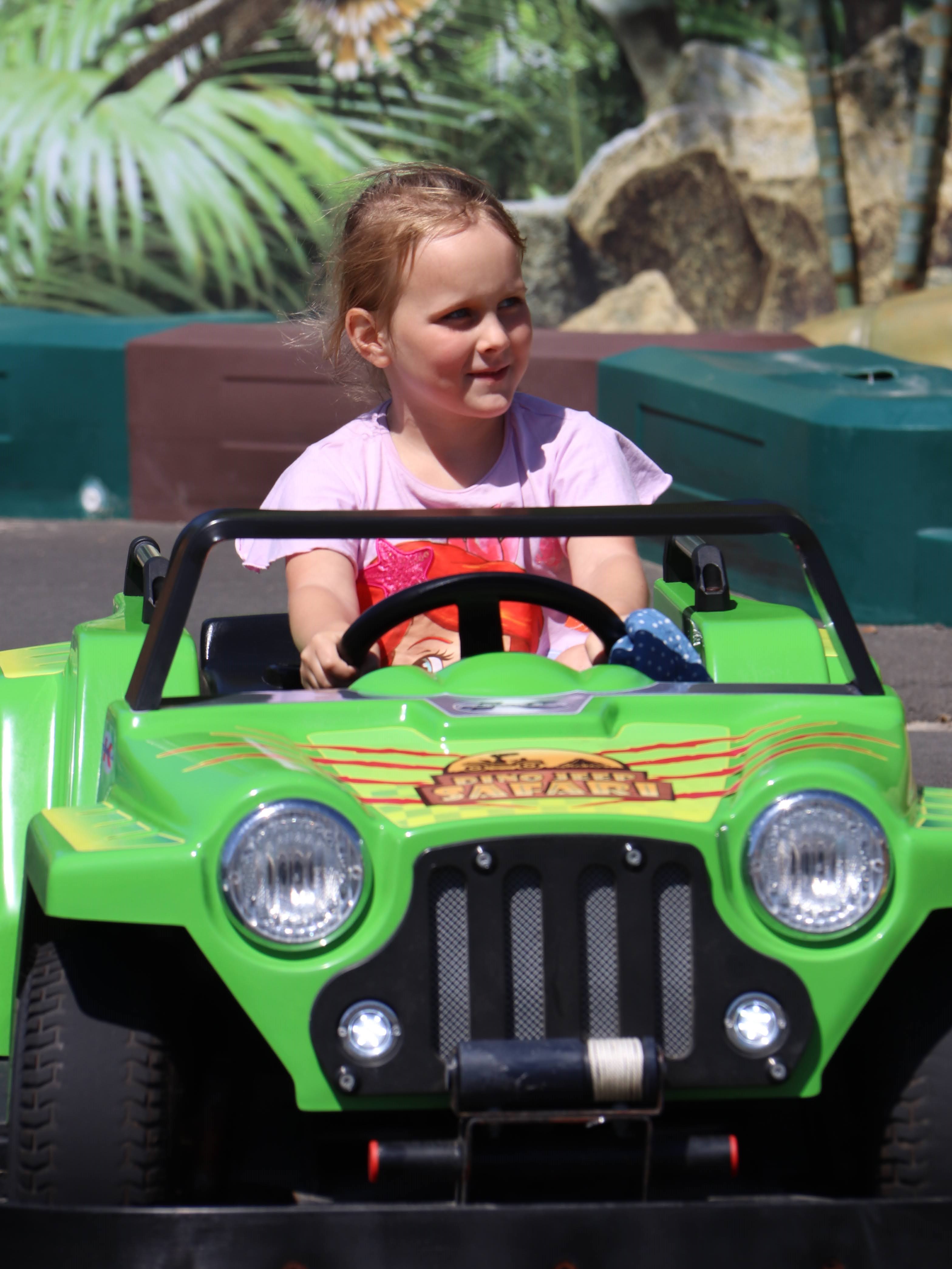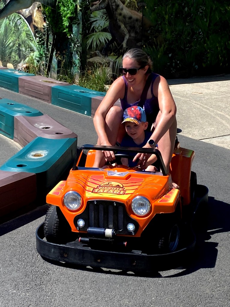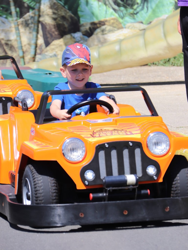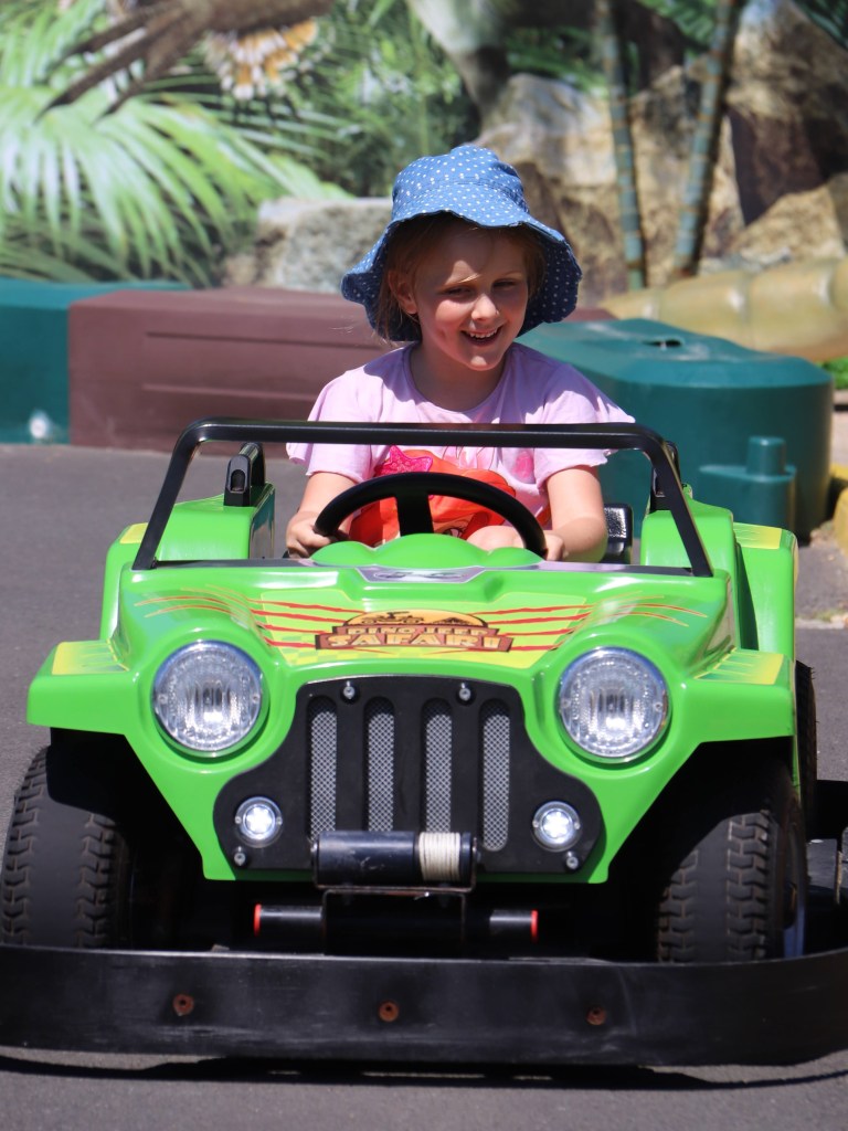 In line with the Jurassic theme, they then moved on to the Dinosaur Safari car driving next door. There was a lot of excitement from both children to start with – neither of them have done much driving before.