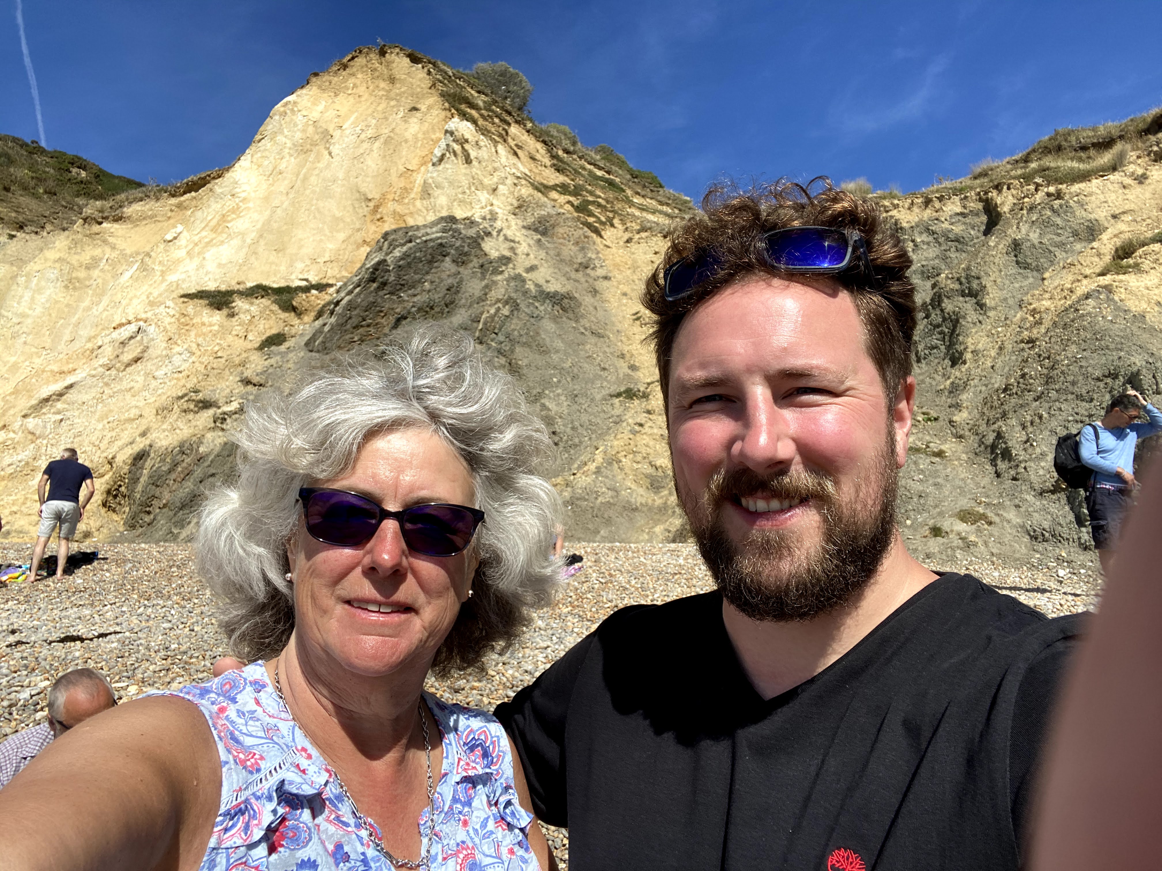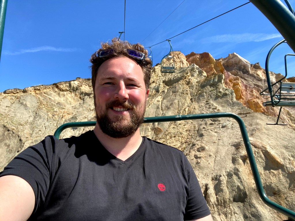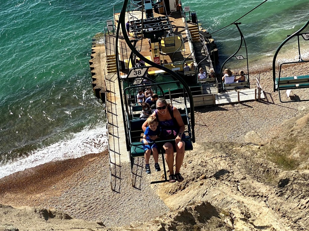 I headed to the chair lift and started the perilous journey down to the beach. I saw the girl in front of me lose her hat on the way down, but that didn’t stop me taking pictures and selfies. Oh dear! I came over the brow of the cliff and quickly spotted everyone down on the beach. They spotted me too so there was a minute or so of frantic waving as I gracefully descended down to sea level.